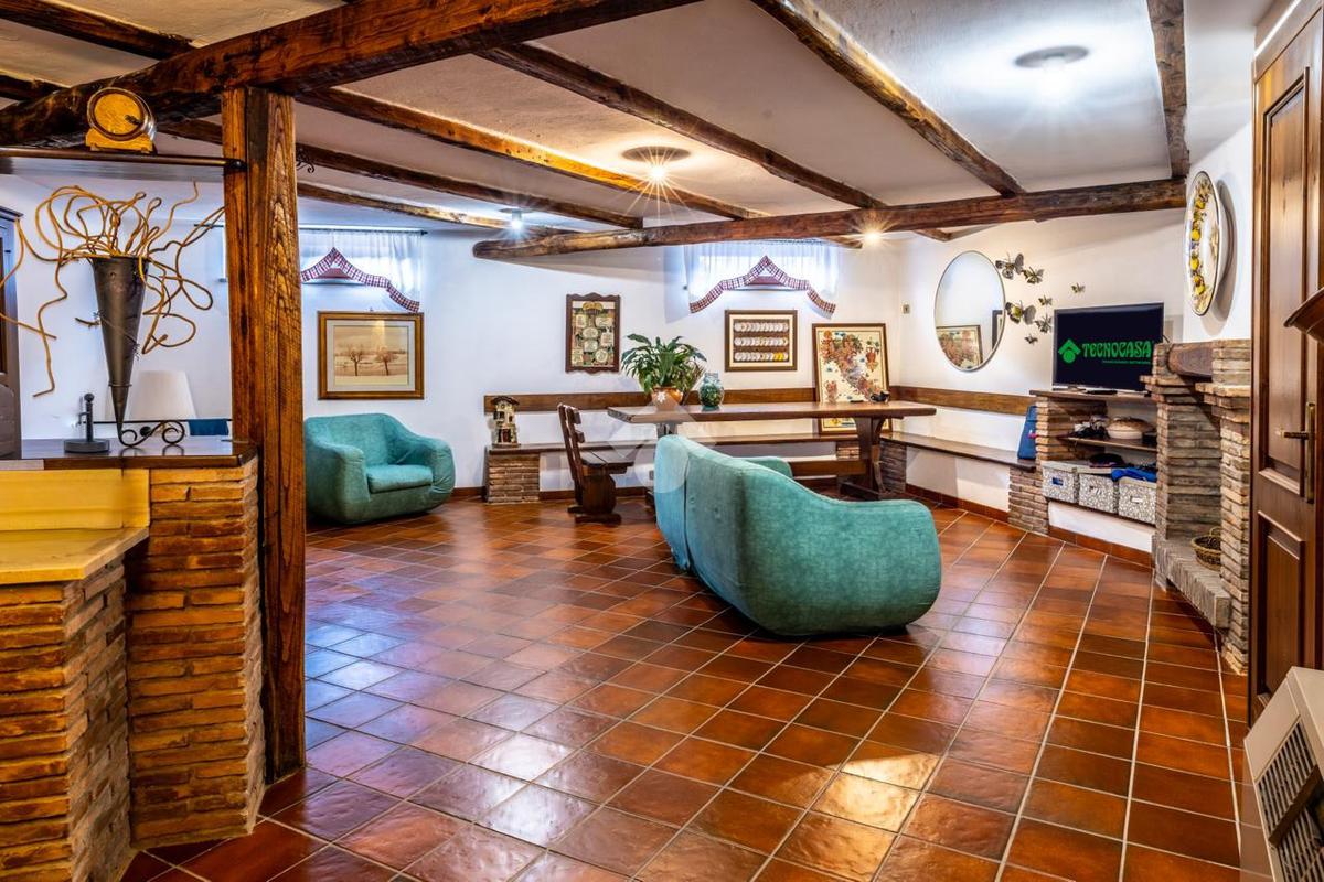 Piano interrato: ampia sala hobby con terzo camino, bagno, cantina e garage, ideale come spazio multifunzionale o area relax.